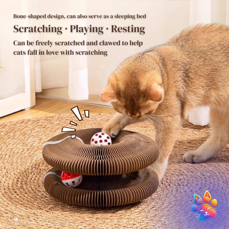 A double-layer corrugated cardboard scratching board that keeps your cat entertained with natural scratching texture and a fun rolling ball for interactive play.